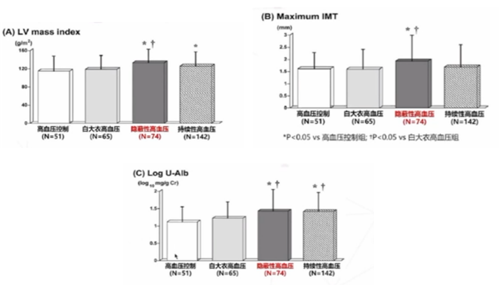 IDACO研究結(jié)果指出,隱蔽性高血壓患者心血管風(fēng)險(xiǎn)較高,其靶器官損傷程度及相關(guān)的心血管風(fēng)險(xiǎn)明顯高于正常血壓者,且與持續(xù)性高血壓患者相似(圖3)。