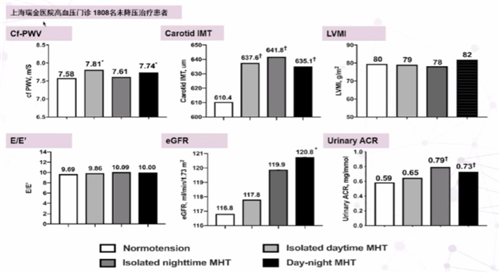 上海瑞金醫(yī)院對高血壓門診1808名未接受降壓治療患者進(jìn)行研究,對不同隱蔽性高血壓亞型進(jìn)行探索,結(jié)果發(fā)現(xiàn),無論是何種隱蔽性高血壓患者(白天血壓增高、夜間血壓增高、白天和夜間血壓均增高)都會出現(xiàn)不同程度的腎臟、血管等靶器官損傷(圖2)。